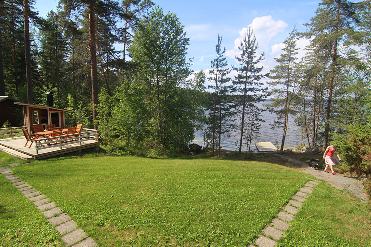 Huvila sijaitsee 20 metriä rannasta, jossa loiva kallio kaartuu veteen ja alkaa hiekkapohjainen, lapsiystävällinen ranta.